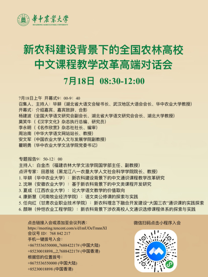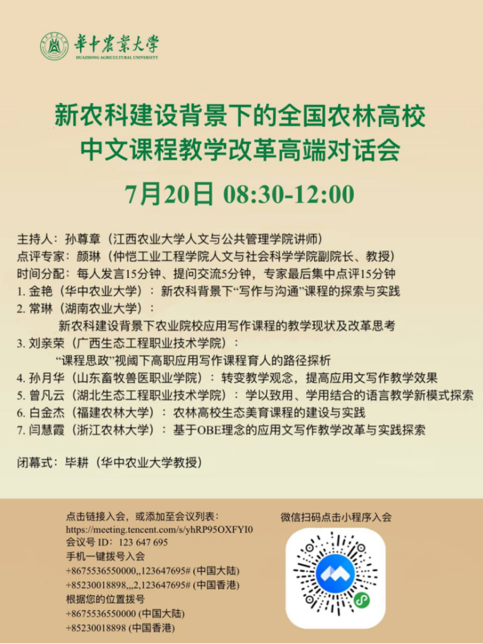 2020年7月18—20日,英国上市365李国英经理、胡红林书记、正处级组织员葛丽娅和公共语文教研室教师以腾讯会议的形式参加了新农科建设背景下的全国农林高校中文课程教学改革高端对话会。