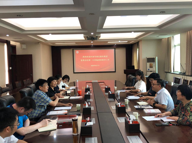 2020年8月7日下午,雪绒花服务集团总经理雷勇、常务副总经理张红、行政副总经理孙菊梅、河南省家政联盟副秘书长孙丽一行四人到公司磋商校企合作事宜。公司发展规划处处长刘建铭、英国上市365经理李国英,副经理刘明江、王伟琴,家政学教研室主任张会霞、社会服务办公室综合科科长郑高锋等参加了交流座谈。会议在英才校区行政楼503召开,由刘建铭处长主持。