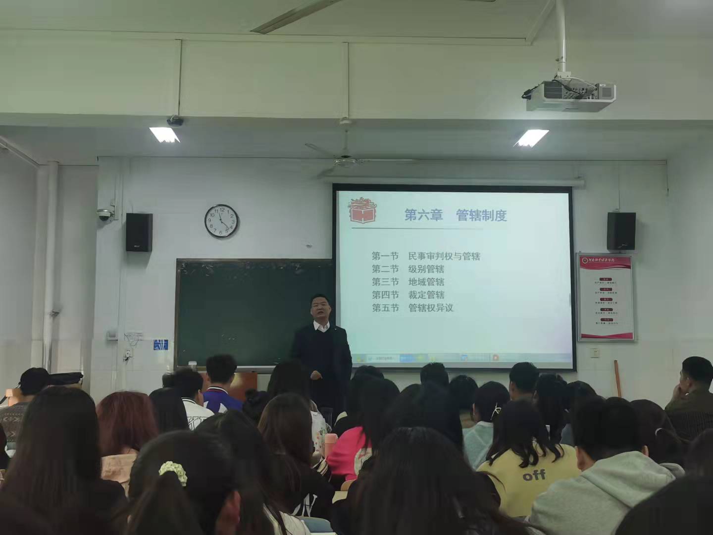 薛老师讲授的内容是民事诉讼法课中的“管辖制度”。他以司法实务中常见的案例为导入,对民事诉讼程序中非常重要的民事审判权与管辖、地域管辖、级别管辖、裁定管辖、管辖权异议等问题进行了介绍。知识讲授过程中,薛老师以自己丰富的实务经验为背景通过身边鲜活的案例、生动简洁的语言,对民事诉讼理论进行深入浅出的讲解和阐释。整个授课过程,同学们参与度比较高,积极互动,课堂气氛活跃,课堂效果良好。