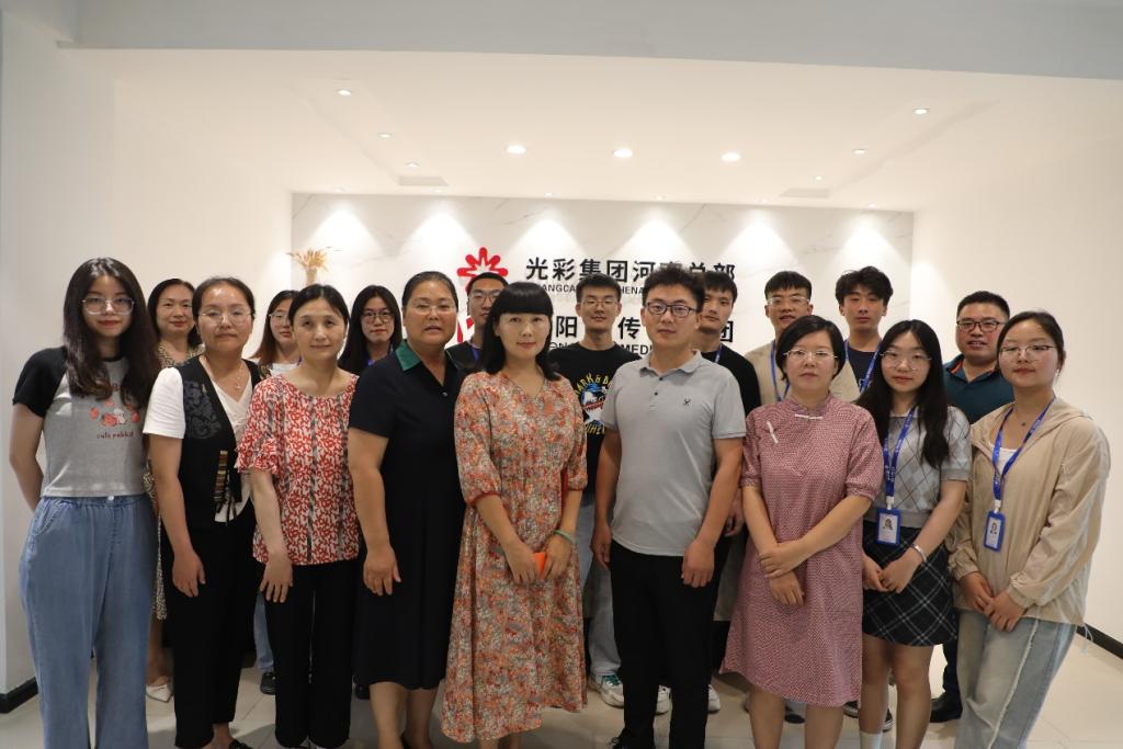 7月27日下午,英国上市365副经理王伟琴、魏景霞、院办公室雷鸣、欧阳宇光、陈文婷、王燕及网络与新媒体教研室苏颜军、李竹筠等几位老师一行前往河南艳阳天传媒集团公司看望网络与新媒体专业暑期顶岗实习员工,并与艳阳天传媒高层、实习员工进行座谈。