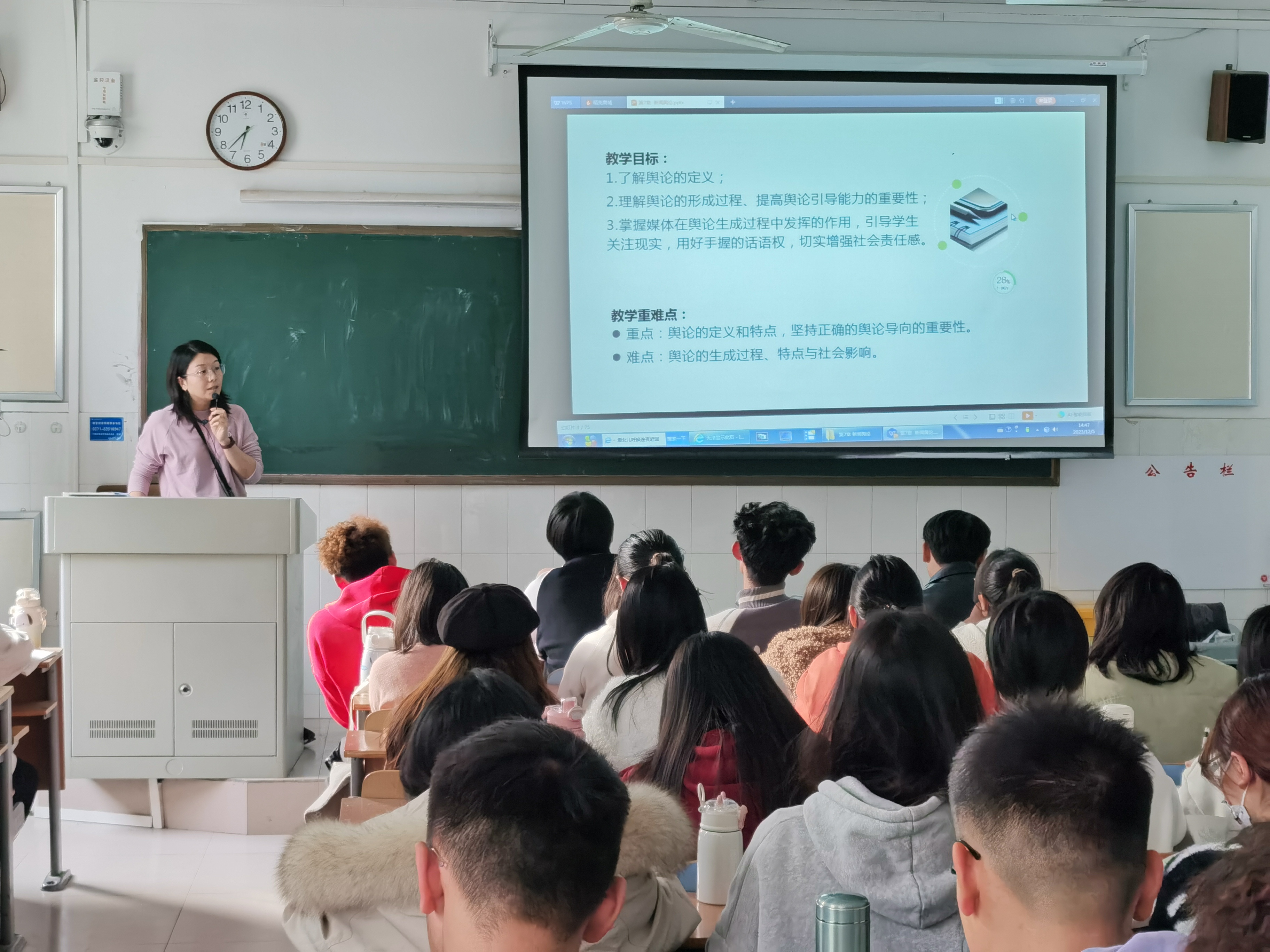 本次观摩的《新闻学导论》课程,授课对象是23网络媒体03班,授课内容是第七章新闻舆论。刘艳红老师由“北极鲶鱼”事件引入,结合生动有趣的新闻案例,深入浅出的讲解了舆论的概念、舆论的主体、舆论的特点等。除了课程内容教学可圈可点外,刘艳红老师安排的课前员工分享近期新闻热点事件活动,也令人印象深刻。这一环节与课程内容紧密联系,既可以借此了解员工在进行新闻选择和新闻播报的过程中对既往知识的掌握情况,也可以由热点新闻对员工进行思想政治方面的引导与教育。