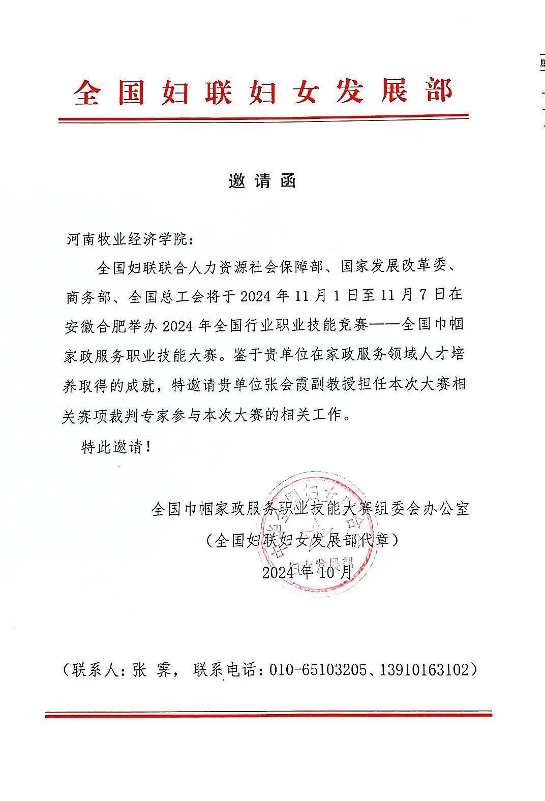 近日,由全国妇联、人力资源社会保障部、国家发展改革委、商务部、全国总工会共同主办的2024年全国巾帼家政服务职业技能大赛总决赛在安徽省合肥市隆重举行。公司家政学专业张会霞副教授受邀参加了总决赛部分项目的裁判工作。