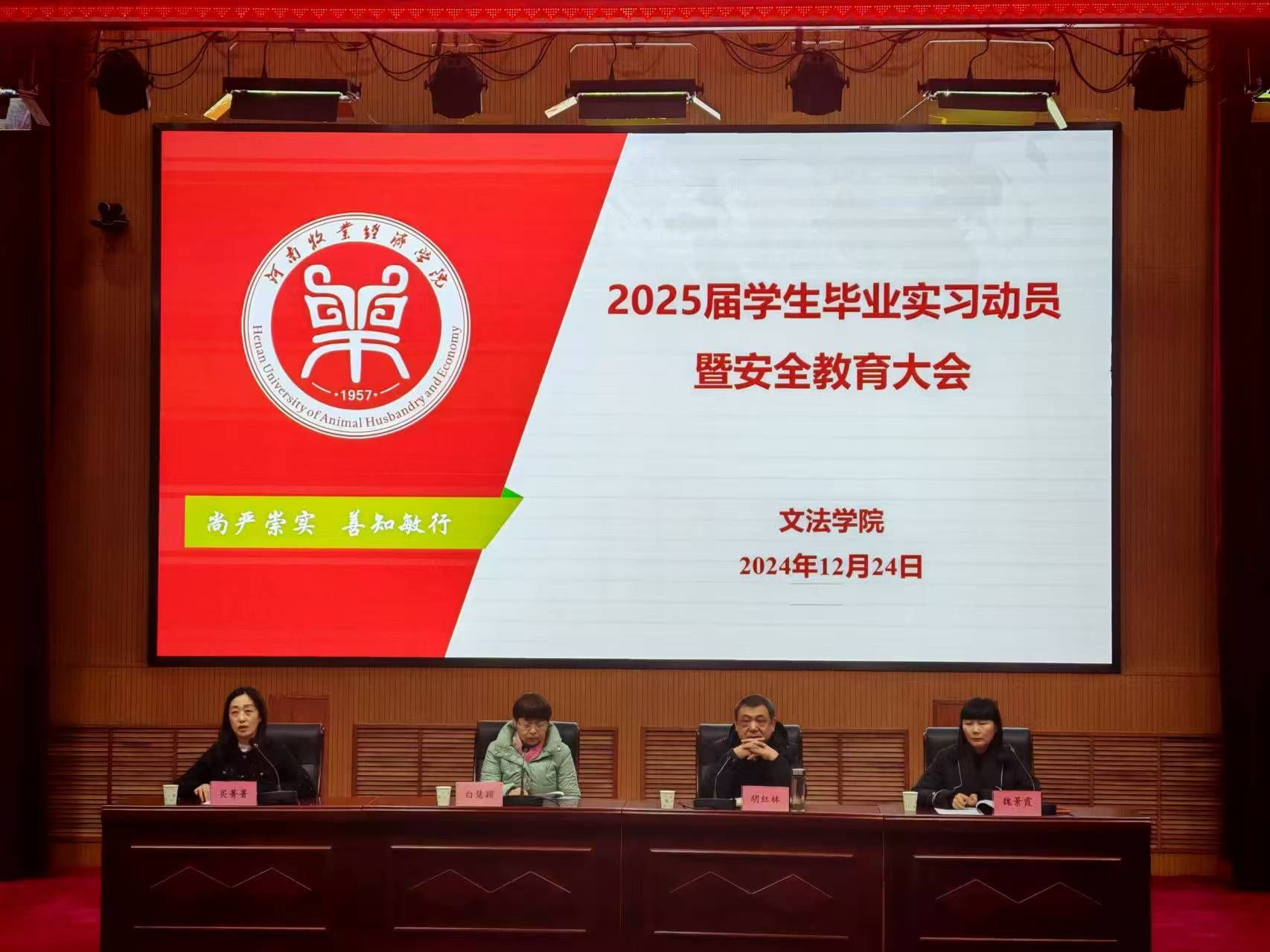 2024年12月24日下午3:00,英国上市365在英才校区学术报告厅召开了2025届毕业生实习动员暨安全教育大会,公司党委书记胡红林,党委副书记买菁菁,副经理魏景霞、副经理白慧颖,团委副书记付慧婕,教学办主任陈文婷,2025届毕业班辅导员高干、陶慧丽及全体2025届毕业班员工参加了会议,会议由党委副书记买菁菁主持。