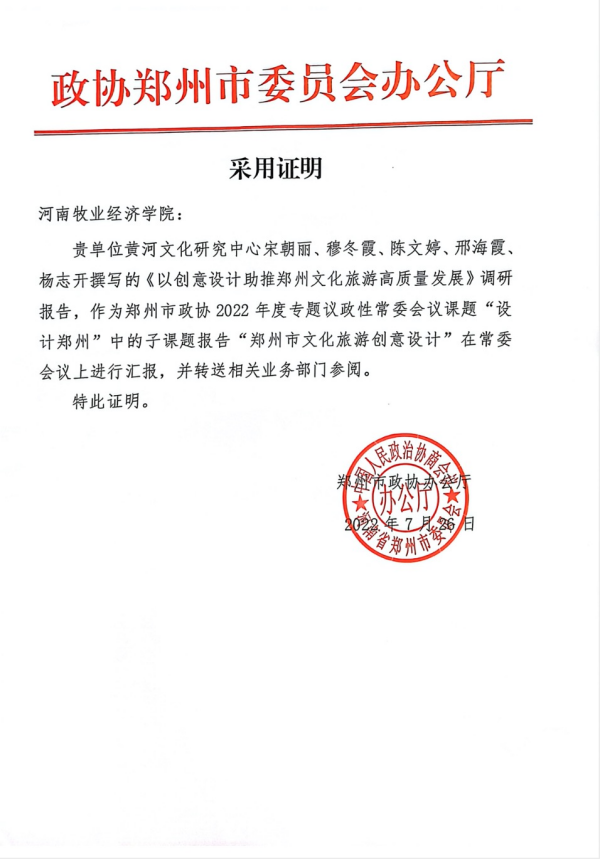 目前,研究报告已作为郑州市政协2022年度专题议政性常委会会议课题“设计郑州”中的子课题报告“郑州市文化旅游创意设计”在市政协常委会上进行汇报,得到市政协领导及委员的高度认可,课题成果被郑州市政协全文采用并转送相关业务部门参阅,为下一步政府部门“设计郑州”相关政策的制定提供了决策参考。