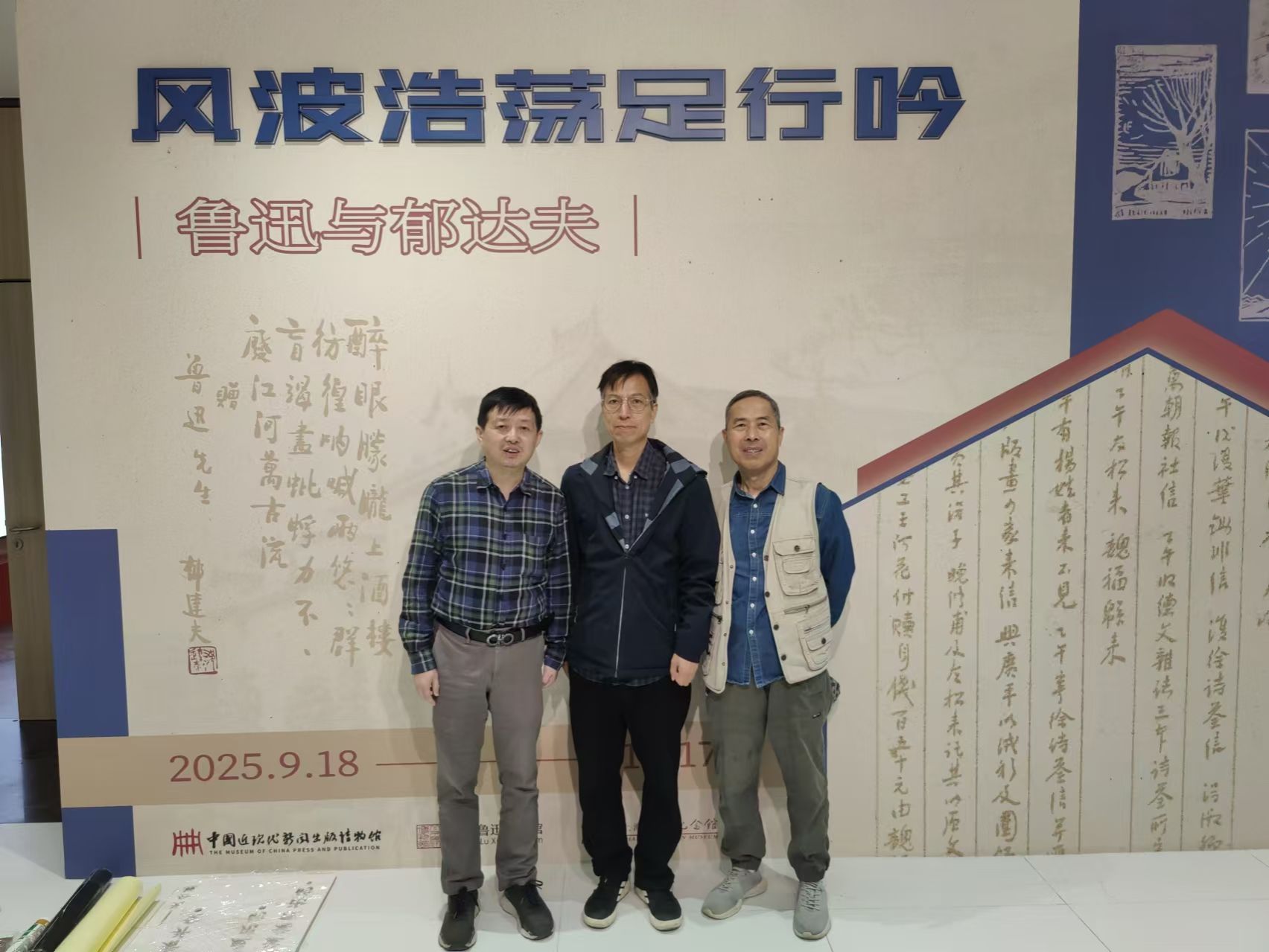 上海是中国近现代新闻出版业的发源地和报刊中心,史料丰富,文物辐集,馆内珍藏有巴金手稿,《古今图书集成》铜活字印本,《鲁迅全集》1938年版本,晚清至建国之间的各种报刊杂志的初版本等。博物馆藏品部陈韻先生接待并带领参观。陈先生早年在上海图书公司工作,是古籍鉴定的专家。主客一行先是参观了二楼主题馆,陈先生对中国新闻出版的历史做了详细而生动的介绍。然后来到五楼临展厅,参观了“风波浩荡足行吟——鲁迅与郁达夫”的展览,其中很多展品来自北京鲁迅博物馆和上海鲁迅纪念馆。临展虽然不大,但有众多名家真迹。