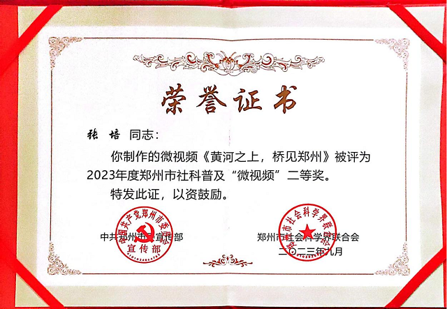 公司张培博士作品喜获2023年度郑州社科普及“微视频”评比二等奖