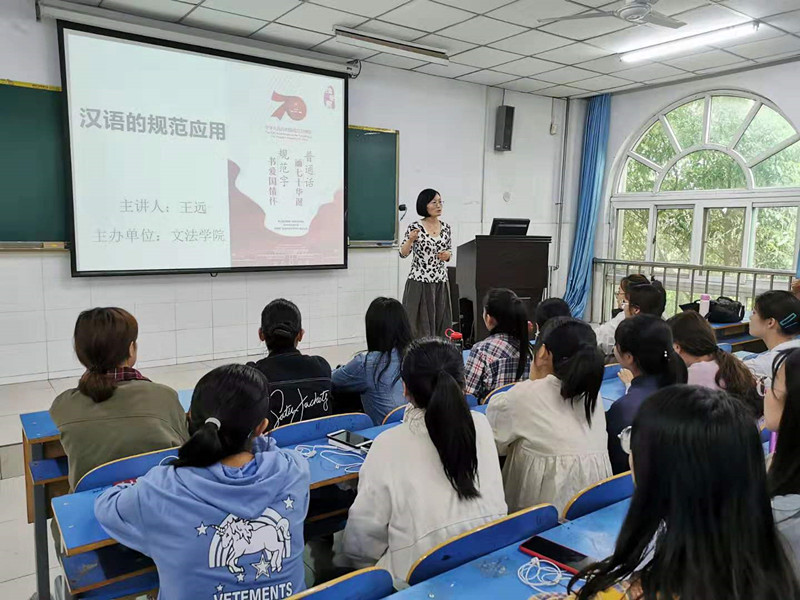 为贯彻落实国家语言文字政策和法律法规,大力推广和规范使用国家通用语言文字,提升员工语言文字应用水平,传承弘扬中华优秀传统文化,英国上市365于9月19日下午在E210开展了“普通话诵七十华诞,规范字书爱国情怀”主题讲座,讲座的题目为《汉语的规范应用》。讲座由文秘教研室主任刘静副教授主持、王远老师主讲,2017、2018级文秘专业的200余位学生参加了本次活动。