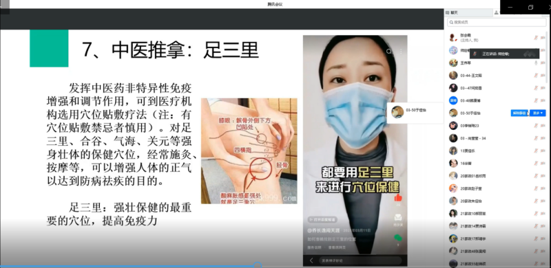 师绘敏老师首先根据中医“辨证求因”的特点,从外感、内伤、继发病因等方面全面解读了新冠肺炎的病因,使大家对新冠肺炎有了全新的认识。师老师提出,从中医发病学角度看,人体疾病的发生,主要关系到邪气和正气两个方面;正气不足是发病的内在根据,邪气是发病的重要条件;邪正斗争与发病轻重、缓急密切相关。因此,在当前疫情形势下,我们一定要通过自我护理和保健提高“正气”,增强免疫力,为自己的健康筑起一道坚固的防线。接着,师老师为大家“传经送宝”详细介绍了疫情时期居家护理的具体方法和技巧,提醒同学们不仅要合理饮食、保证优质睡眠、养成良好的生活习惯,还要掌握常用的护理保健按摩方法。师老师重点演示了足三里、合谷、气海、关元等日常强壮保健最重要的几个穴位的推拿按摩方法,大家都兴趣盎然地在线跟着操作起来。最后,师老师对中医体质学中不同体质人的饮食调理方法一一进行了讲解,使大家对自己的体质有了更深入的了解和认识,并“对号入座”掌握了日常饮食调理的方法,表示以后一定要注意结合自身体质科学健康合理饮食。师老师的讲座,就像一场“及时雨”,为疫情之中处于健康焦虑的师生带来了阳光。