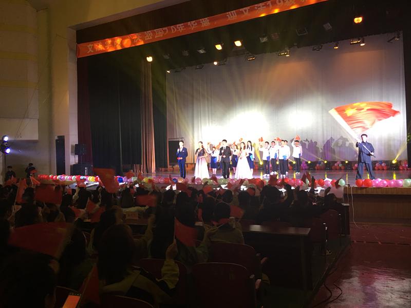 节目开始了,首先是由校舞蹈队和触摸天空动漫社带来的开场舞,全场气氛瞬间被点燃,台上的舞蹈与下面的掌声交相辉映,同学都沉浸在激动与欢乐之中。《爱的华尔兹》交际舞表演登场了,伴随着优美的音乐,演员们翩翩起舞,多变的舞姿,优雅的动作,让人沉醉其中。歌曲串烧引来阵阵的掌声与呐喊,一首首耳熟能详的歌曲勾起人们美好的回忆。精彩的武术表演让同学们看到了中华武术的魅力,激发了大家强烈的民族自豪感。汉服走秀美轮美奂,展现了中华文化的无穷魅力。健美操节奏明快,动感十足,热情四射,彰显了青春的活力和奋发向上的精神。诗朗诵《我和我的祖国》抒发了莘莘学子对祖国的深厚感情,激起了观众的强烈共鸣。大合唱《歌唱祖国》把晚会推向了高潮,台上演员和台下观众挥舞国旗,共同引吭高歌,唱响了时代的强音,唱出了大家的心声。