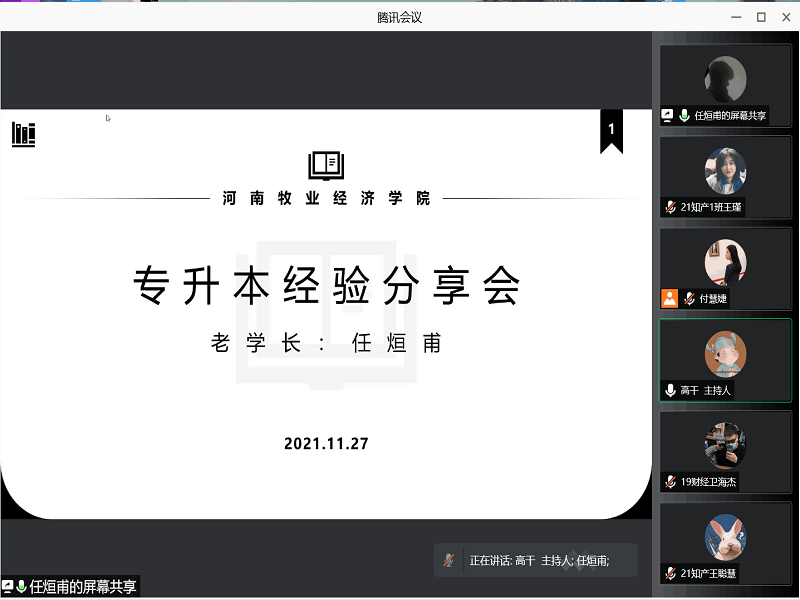 会议开始,白渰灏同学在去年的专升本考试中,以优异成绩考入河南师范大学汉语言专业。谈到复习备考的经验时,他指出英语备考的重要性,并给出了指导意见和学习方法,同时对于关于专业课,也分享了相关学习技巧。其中也指出备考过程中注意劳逸结合,合理利用时间。任烜甫同学以优异成绩考入河南工程公司的行政管理专业。他主要从目标、应试、背书、做题、心态四个方面进行了分享。而后的汤萍同学和陈心茹同学分别进入了河南财经政法大学和河南师范大学,同时被法学专业录取,两人从不同的方面介绍了法学专业的学习,拓充了学习法学的新方法和新技巧,尤其又重点提出学习英语的重要性和学习效率的同步提高,避免“假学习”带来的危害,为学弟学妹们给予了自己成功专升本的经验,希望助力学弟学妹的成功上岸。